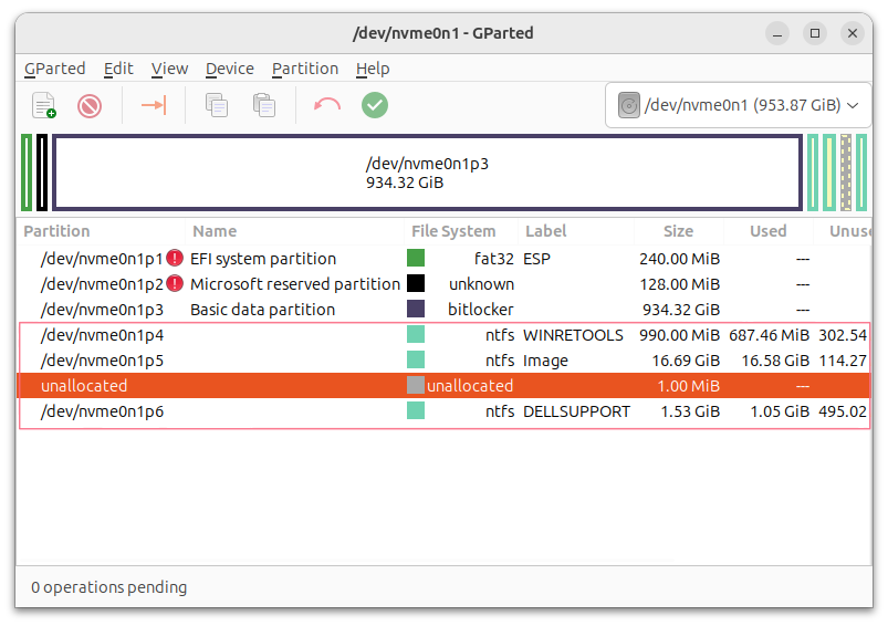 XPS 13 Plus のディスクの初期状態. 赤で囲んだ末尾の3つのパーティション {WINRETOOL, Image, DELLSUPPORT} を残しておけば Windows 11 を回復できます(工場出荷状態にもどせます). |