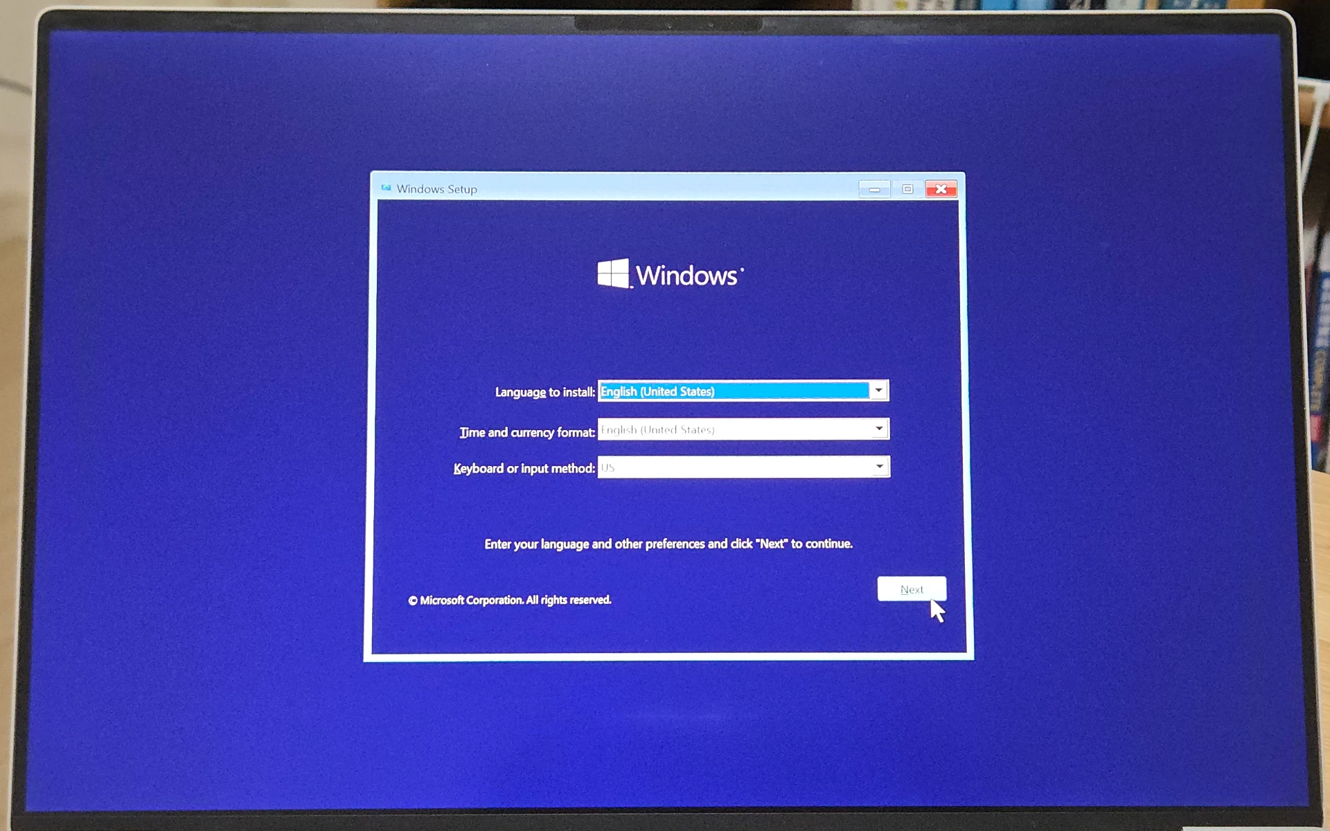 - Windows 10 では ここで言語やキーボードが選べます…けど,どのみちリカバリーで消える儚い命なので 単に Next でよいと思います.