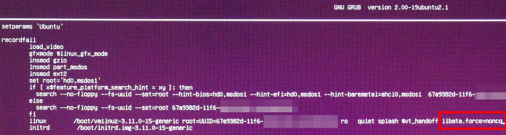 | 変更後 | GRUB_CMDLINE_LINUX_DEFAULT="quiet splash libata.force=noncq" |