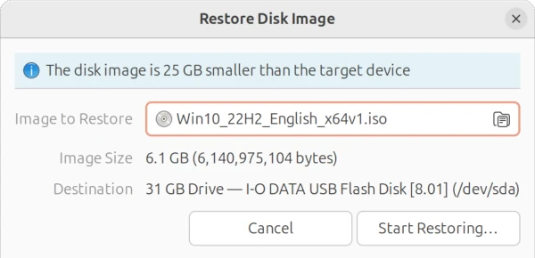 | 図A1-2. ISOイメージファイルが 6.1 GB なのに対して USB メモリーが 32 GB あるため 「ディスクイメージがコピー先より 25 GB 小さい」という情報がでているけど 気にしなくてよい(コピー先のUSBメモリーのサイズにあわされて あまった部分は空き領域になる). |