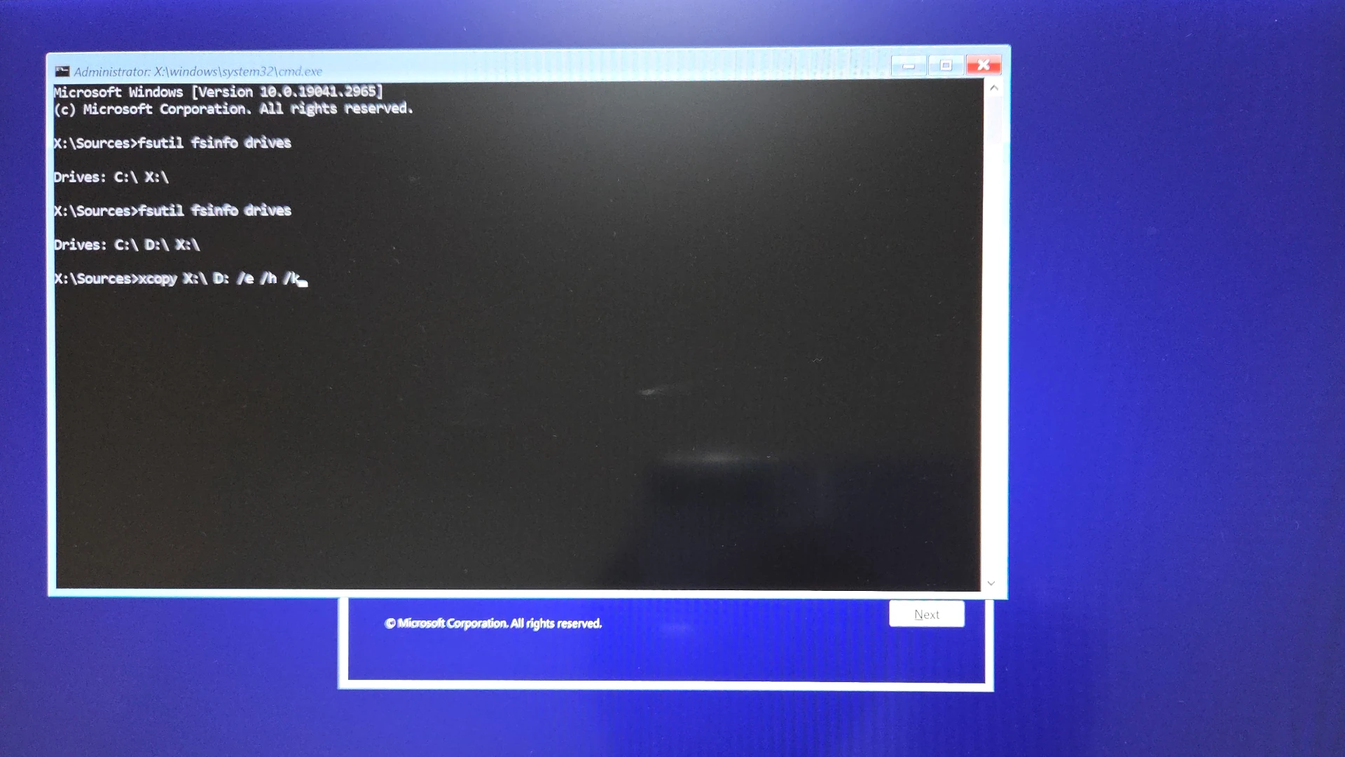 xcopy X:\ D: /e /h /k- 要するにインストールメディアから全ファイルをコピーします