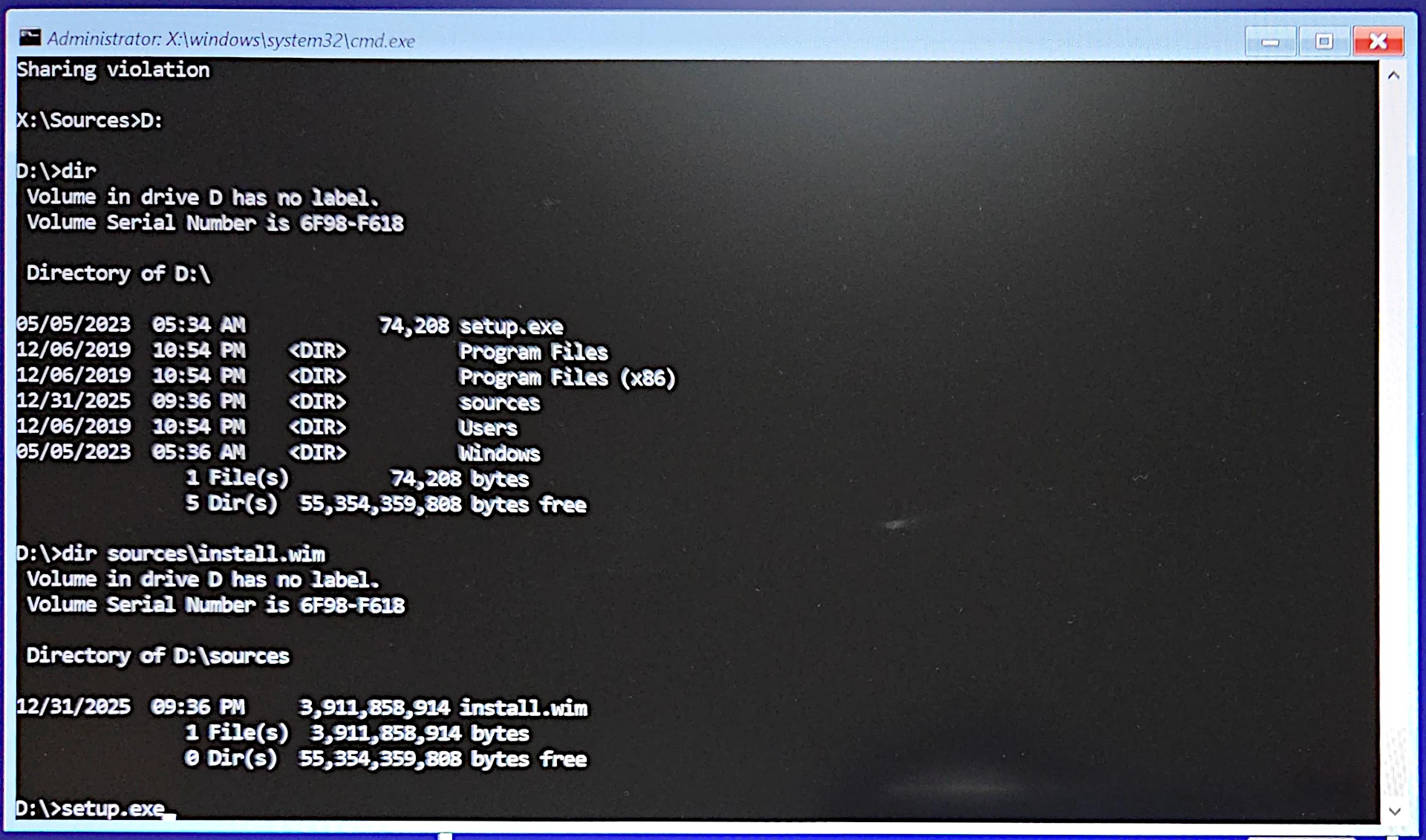 install.wimを継ぎ足したUSBメモリーを再度 XPS 13 Plus に接続D:dir sources\install.exeして正しくコピーされていることを確認setup.exe
